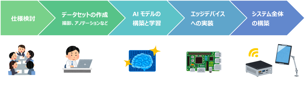 こうした利点の反面、エッジ AI の実現には高い技術が必要であり、限られた計算リソースや電力リソース、重量的な制限や厳しい環境要件など、さまざまな制約を乗り越える必要があります。弊社はこうしたエッジ AI 開発を得意としており、多数の実績があります。防水防塵性やバッテリー駆動の必要性など、利用シーンにおける各種要件を踏まえ、最適な AI アルゴリズムや実装デバイスを選択し、お客様のニーズに応えます。