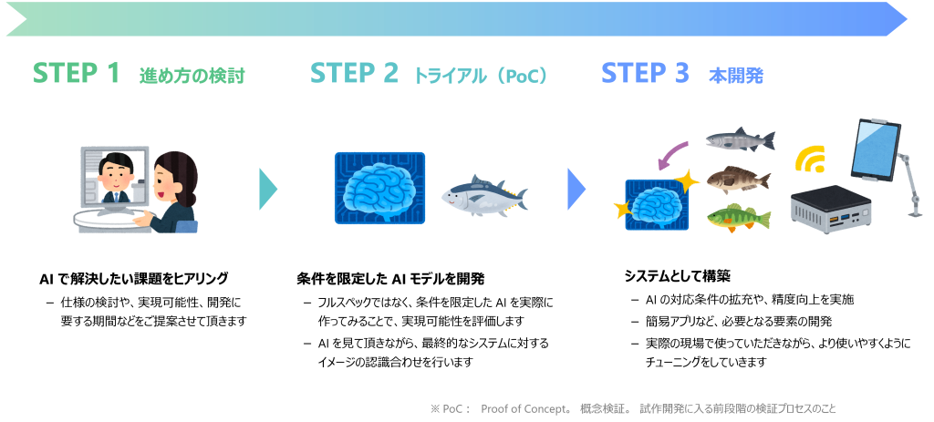 AI ソリューションでは、各ステップでの継続的なコンサルティングにより、着実に最終目標に向かいます。「これまでの AI 導入はあまり上手くいかなかった」というお客様にこそ、弊社の AI ソリューションの価値を感じていただけると考えています。